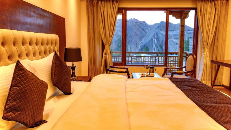 Guests will experience the views of snow-capped mountains; stunning Sa-mar-kem-kem (Red colored Mountain) in the rear and Rocky Caves (the Dagi-Banga) trailing down beneath the powerful Indus River in the front. In the center of the Valley, the hotel is only a short stroll from the famous Alchi Monastery (a national Heritage).
